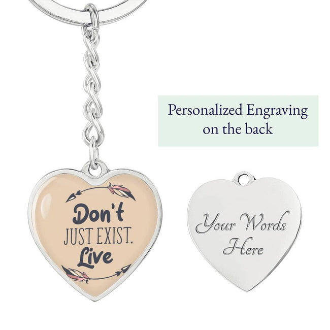 Don't Just Exist, Live. Inspirational words to live by. A beautiful strong yet subtle design stands out on this graphic heart keychain. What better way to stay inspired and motivated than with a keychain you can take with you every where you go. This heart pendant keychain makes the perfect inspirational and motivational gift for loved ones.